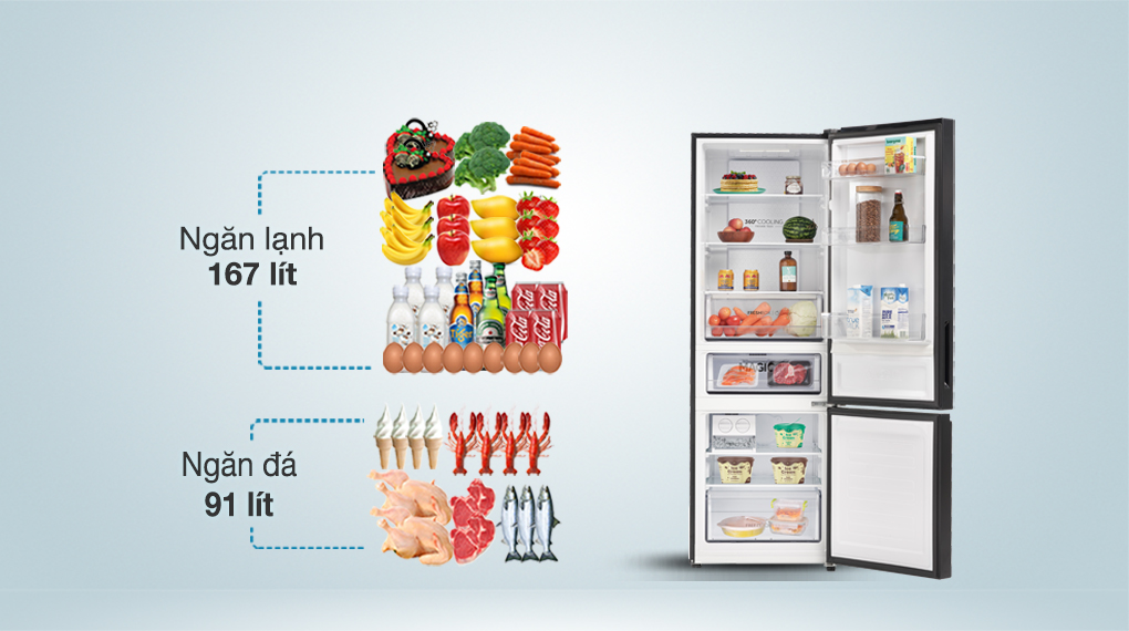 – Ngăn đá có dung tích 91 lít, được thiết kế 1 kệ chia làm 2 ngăn, 1 hộp làm đá và 1 ngăn chứa.