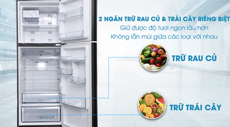 Độc đáo với thiết kế 2 ngăn trữ rau & quả riêng biệt để cung cấp mức nhiệt lý tưởng cho mỗi ngăn. Nhờ đó, tủ lạnh này có thể duy trì độ ẩm ổn định để rau củ và trái cây được bảo quản tươi ngon, mọng nước như lúc mới mua về.