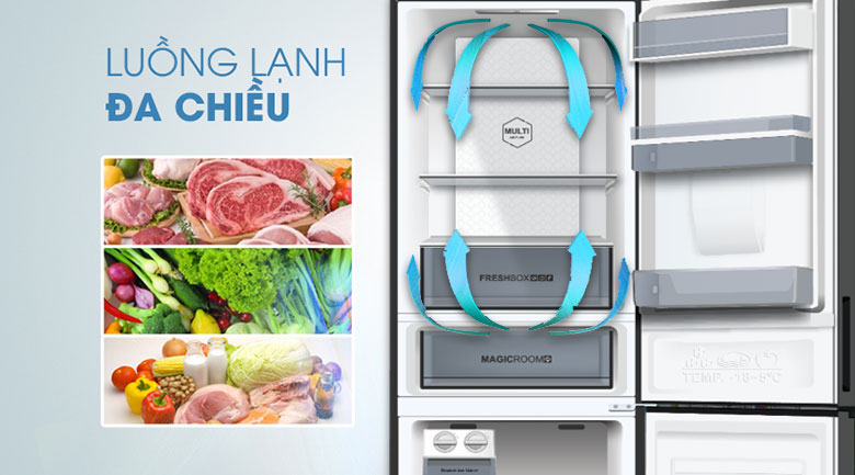Với công nghệ làm lạnh đa chiều, hơi lạnh sẽ lan tỏa khắp mọi ngóc ngách, mọi vị trí trong tủ, làm lạnh đồng đều, duy trì nhiệt độ, độ ẩm ổn định, bảo quản thực phẩm tốt nhất, cho thực phẩm luôn tươi ngon.