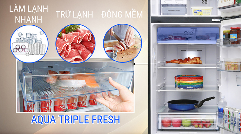 Ngăn chứa Aqua Triple Fresh là 1 ngăn đặc biệt mà người dùng có thể chọn lựa chức năng tuỳ cho mục đích sử dụng, trong đó có 3 chức năng là: làm lạnh nhanh, trữ lạnh và đông mềm.