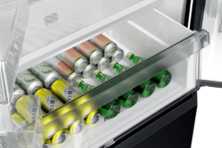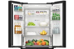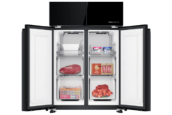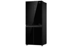 – Cửa tủ lạnh được thiết kế với mặt kính màu đen chủ đạo, mang lại vẻ hiện đại, sang trọng cho không gian bếp. Bề mặt này giúp việc vệ sinh tủ dễ dàng, chống trầy xước và giữ cho tủ lạnh luôn sáng bóng và mới mẻ.