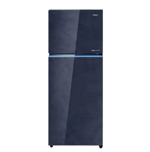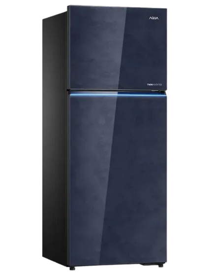 Tủ lạnh Aqua AQR‑TA546FA sở hữu mặt gương màu xanh đen bóng loáng, thiết kế tay nắm ẩn tiện lợi.