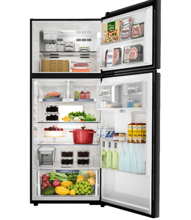 Với tổng dung tích sử dụng lên đến 480 lít (~381 lít ngăn mát, 99 lít ngăn đá), tủ đáp ứng nhu cầu lưu trữ đa dạng cho gia đình 4–5 thành viên, đi kèm hệ thống khay kính chịu lực giúp sắp xếp thực phẩm dễ dàng, tiện lợi hơn