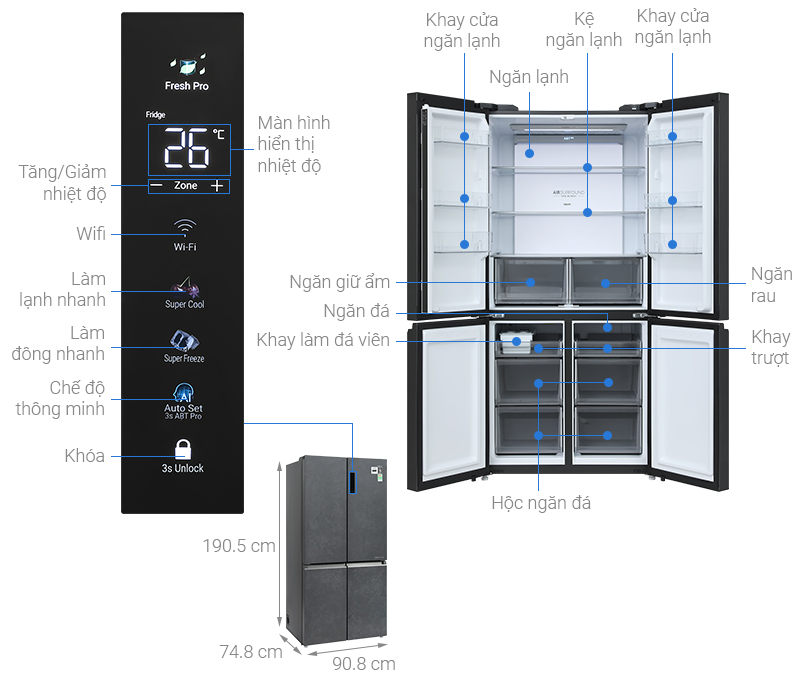 – Công nghệ làm lạnh đa chiều: hệ thống phân phối khí lạnh đồng đều theo dạng vòm cung, bao trọn thực phẩm trong toàn bộ ngăn tủ, giữ nhiệt độ ổn định, hạn chế thổi hơi lạnh trực tiếp vào thực phẩm nên tránh gây tình trạng mất nước, héo khô thực phẩm.