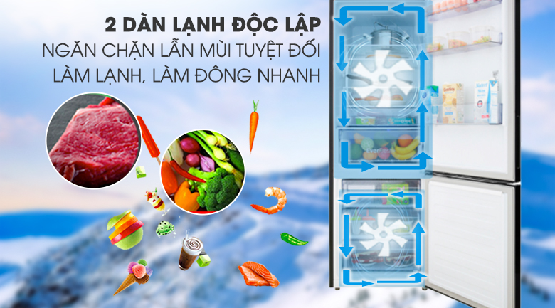 Công nghệ NeoFrost hai dàn lạnh độc lập được trang bị trên tủ lạnh 2 cửa này sẽ giúp cho thực phẩm được giữ tươi lâu hơn và không bị lẫn mùi vào nhau trong suốt quá trình bảo quản. Vì công nghệ này có khả năng làm lạnh nhanh và duy trì nhiệt độ ổn định tại mỗi ngăn tủ.