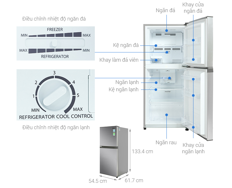 • Kích thước tủ lạnh: Cao 133.4 cm - Rộng 54.5 cm - Sâu 61.7 cm - Nặng 37 kg