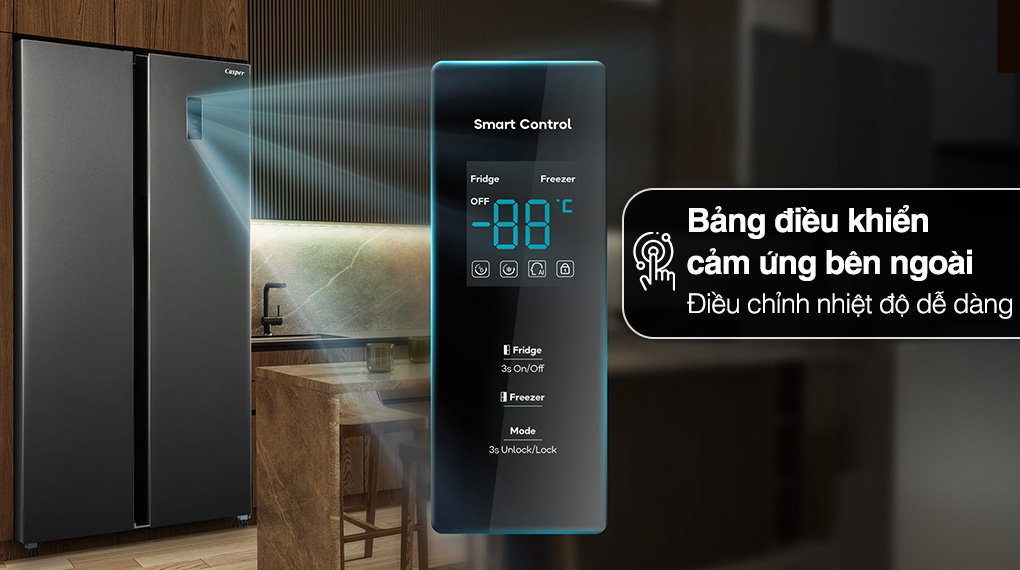 – Bảng điều khiển cảm ứng bên ngoài cửa tủ: dòng tủ lạnh Casper này trang bị bảng điều khiển cảm ứng nhạy bén thiết kế ở mặt ngoài của cánh cửa cho người dùng theo dõi và tùy chọn chức năng chính xác, không cần mở cửa nên giúp tránh lãng phí điện năng tối đa.