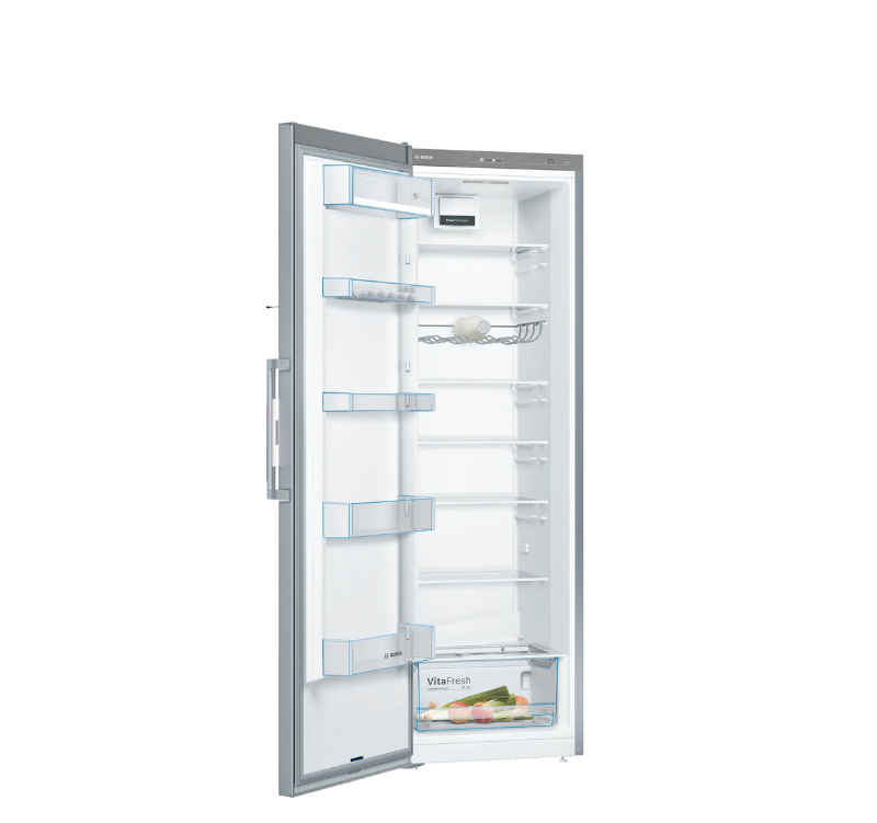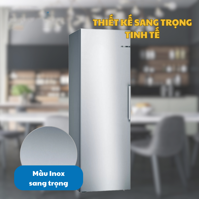 Tủ lạnh Bosch KSV36VI3P Serie 4 có thiết kế sang trọng với một cánh cửa tủ, đi cùng là gam màu inox xám bền bỉ và vững chãi. Vỏ tủ lạnh được làm từ thép không gỉ, bên trên được phủ thêm một lớp chống bám vân tay, giúp tủ lạnh bền bỉ theo thời gian và dễ dàng lau chùi hơn.