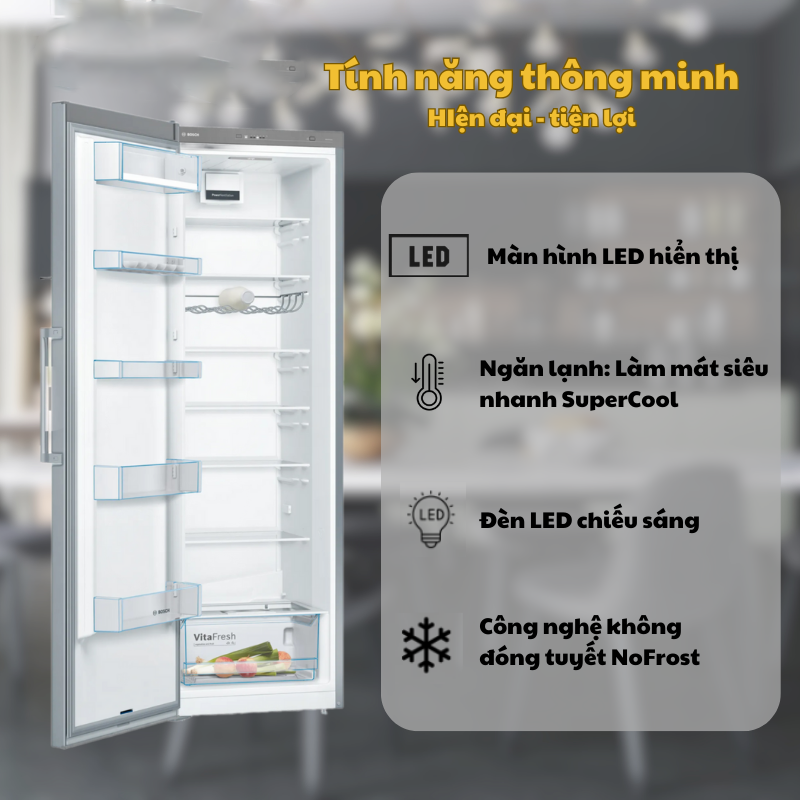 Khi kích hoạt chức năng SuperCooling, nhiệt độ bên trong tủ lạnh Bosch KSV36VI3P sẽ hạ xuống một cách nhanh chóng với mức nhiệt là 2°C. Thực phẩm bên trong tủ sẽ được làm lạnh một cách nhanh chóng ngay khi đưa vào. Nhưng để tránh tiêu hao điện năng, chức năng này sẽ tự động chuyển về nhiệt độ ban đầu sau khoảng 6 giờ.