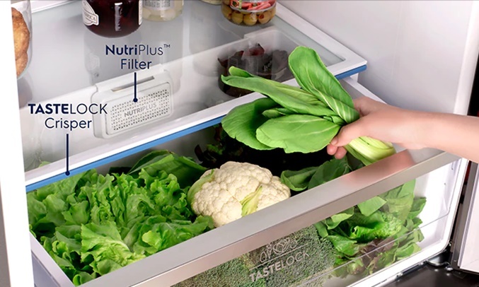Tủ lạnh Electrolux có ngăn rau củ TasteLock cùng gờ cao su khép kín và bộ lọc NutriPlus đem đến không gian khép kín với độ ẩm lý tưởng, đảm bảo chất dinh dưỡng giữ trọn vẹn giúp rau củ tươi ngon trong suốt 7 ngày.