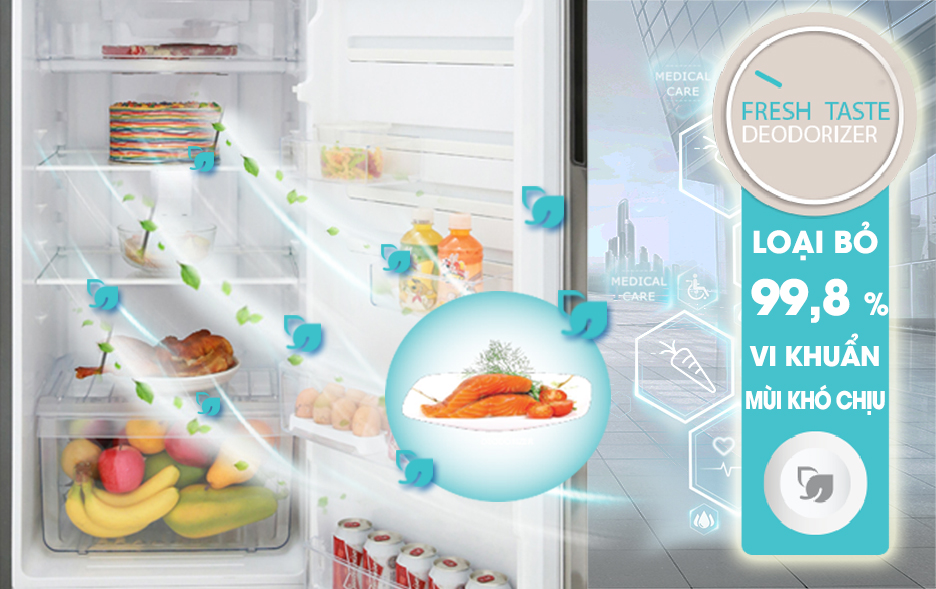 Tủ lạnh được trang bị hệ thống khử mùi Fresh Taste có khả năng loại bỏ đến 99,8% vi khuẩn và mùi hôi do thực phẩm gây ra. Giờ đây bạn sẽ không còn bị “ám ảnh” vì mùi hôi khó chịu mỗi lần mở tủ lạnh nữa.