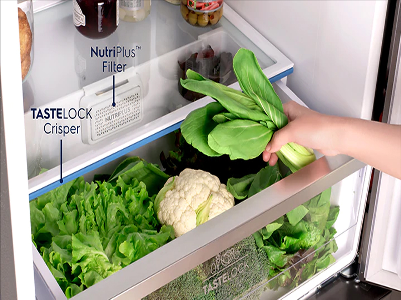Ngăn rau củ TasteLock cùng gờ cao su khép kín và bộ lọc NutriPlus đem đến một không gian khép kín với độ ẩm lý tưởng, đảm bảo chất dinh dưỡng được giữ trọn vẹn giúp rau củ tươi ngon trong suốt 7 ngày.