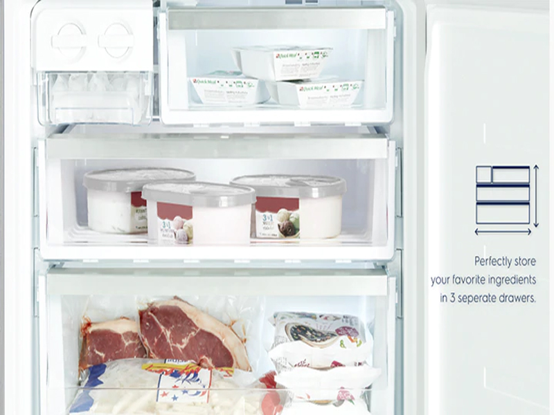 Ngăn đông 125 Lít với 3 ngăn kéo riêng biệt cho phép lưu trữ nhiều thực phẩm cùng lúc mà không lo lẫn mùi thực phẩm.