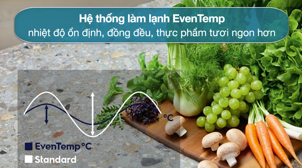 – Hệ thống làm lạnh EvenTemp: Giữ thực phẩm tươi ngon lâu hơn nhờ giảm sự dao động về nhiệt độ bằng cách làm lạnh từng ngăn riêng biệt. Nhờ đó nhiệt độ sẽ được duy trì ổn định trong toàn bộ khoang tủ, đảm bảo thực phẩm được cấp nhiệt đều và tốt nhất, giữ hương vị và cấu trúc lâu hơn.