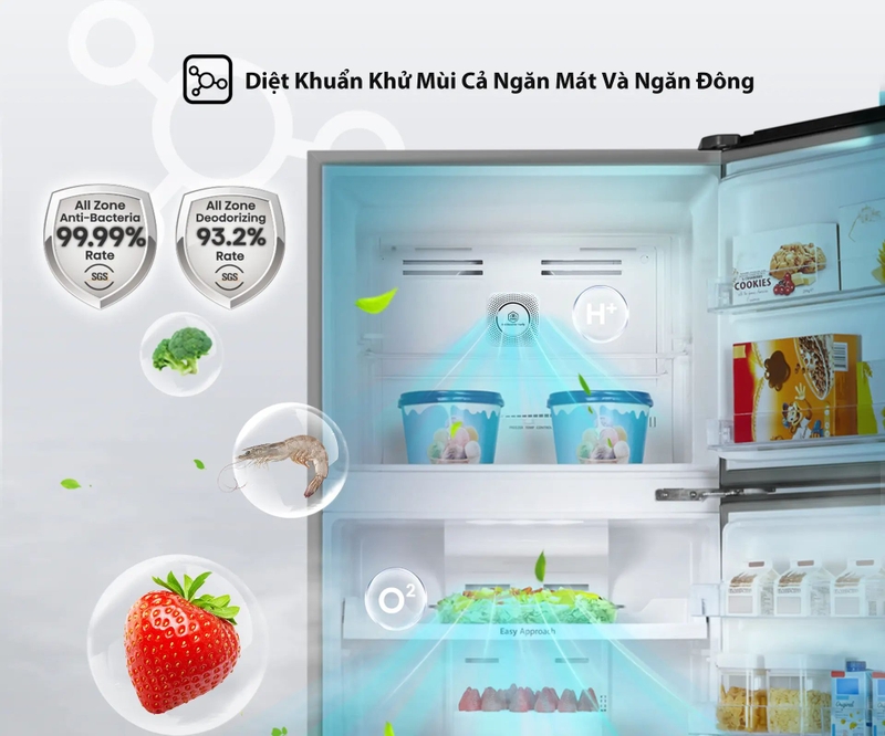 Với Hisense Inverter 424 lít RT549N4EBU , người dùng không còn phải lo lắng về mùi hôi khó chịu hay vi khuẩn phát triển trong tủ. Thiết bị được tích hợp bộ lọc CCA chuyên dụng, được thiết kế riêng cho điều kiện nhiệt độ thấp ở cả ngăn đông và ngăn mát. Nhờ đó, bộ lọc này có khả năng tiêu diệt vi khuẩn đến 99.99% và khử mùi lên tới 93.2%, tạo nên luồng khí trong lành và môi trường lưu trữ an toàn. Ngoài ra, các phân tử nước có tác dụng duy trì độ ẩm và giảm khí Ethylene, góp phần kéo dài độ tươi và làm chậm quá trình chín của các loại trái cây.