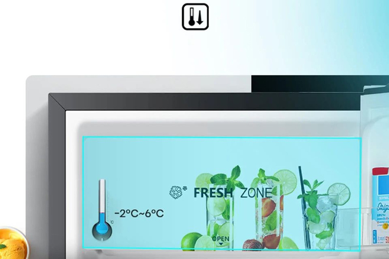 Ngăn làm lạnh Fresh Zone lưu trữ thực phẩm ở nhiệt độ thấp hơn so với các ngăn khác trong tủ. Đặc biệt, ngăn này có nắp đậy kín, giúp hạn chế tình trạng lẫn mùi, phù hợp để bảo quản thịt, cá, hải sản, sản phẩm từ sữa hoặc các loại thực phẩm cần làm lạnh nhanh.