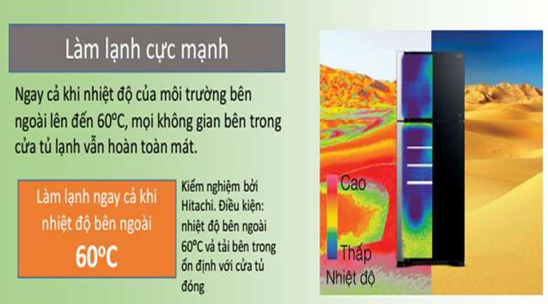 Ngay cả khi nhiệt độ của môi trường bên ngoài lên đến 60°C, mọi không gian bên trong tủ lạnh vẫn hoàn toàn mát. Bên cạnh đó khi mất điện nhiệt độ trong ngăn đá không bị giảm đáng kể và giúp trữ thực phẩm tươi ngon trong suốt 12 giờ