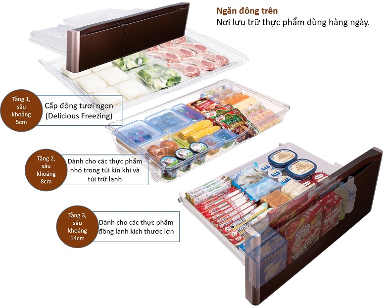 Ngăn đông nhiều tầng, thuận tiện trong việc sắp xếp thực phẩm