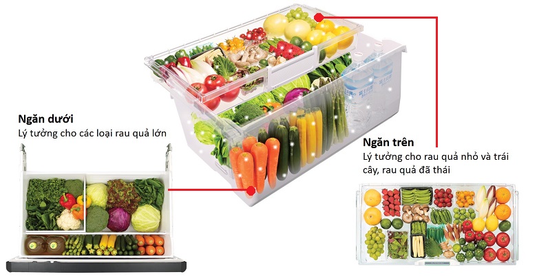 Hơn nữa, ngăn chứa này còn được thiết kế 2 tầng rất đặc biệt, cho phép bạn dễ dàng hơn trong việc phân loại với rau củ kích thước lớn để ở tầng dưới và rau củ nhỏ, trái cây hoặc rau đã thái sẵn đặt ở tầng trên.