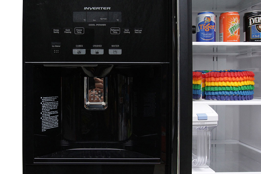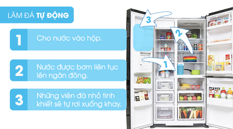Chiếc tủ lạnh này có thể liên tục làm đá tự động, bạn chỉ cần cho nước vào ngăn đựng nước và đá sẽ được làm, sau đó sẽ được đựng trong hộp chứa. Hơn nữa, bạn có thể lấy nước và đá bên ngoài vô cùng dễ dàng mà không cần phải mở tủ, tránh gây mất nhiệt tủ lạnh.