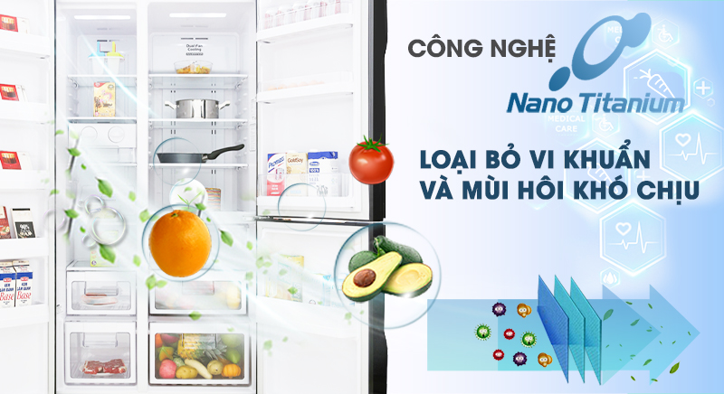 Màng lọc Nano Titanium sẽ đánh bật và loại bỏ hoàn toàn các loại vi khuẩn, nấm mốc gây hại cho sức khỏe của gia đình bạn. Những mùi hôi khó chịu từ thực phẩm sẽ được lọc sạch ra khỏi tủ lạnh, trả lại bầu không khí sạch trong, tạo cảm giác thoải mái, yên tâm cho bạn khi sử dụng thực phẩm.