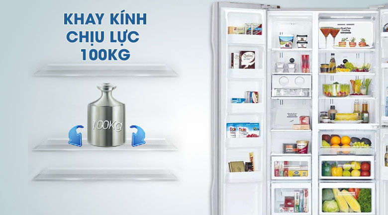 Các khay chứa trong tủ lạnh được làm từ những tấm kính chịu lực bền bỉ lên đến 100kg, nên bạn có thể hoàn toàn yên tâm trong quá trình bảo quản thực phẩm.