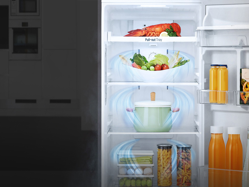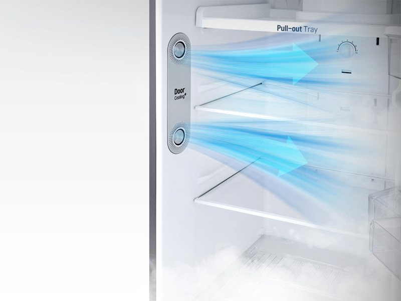 LG DoorCooling+™ giúp cho nhiệt độ bên trong đều hơn và làm mát nhanh hơn 35% so với hệ thống làm mát thông thường. Hệ thống này làm giảm đáng kể sự chênh lệch nhiệt độ giữa phần bên trong và phía cửa của khoang làm mát.