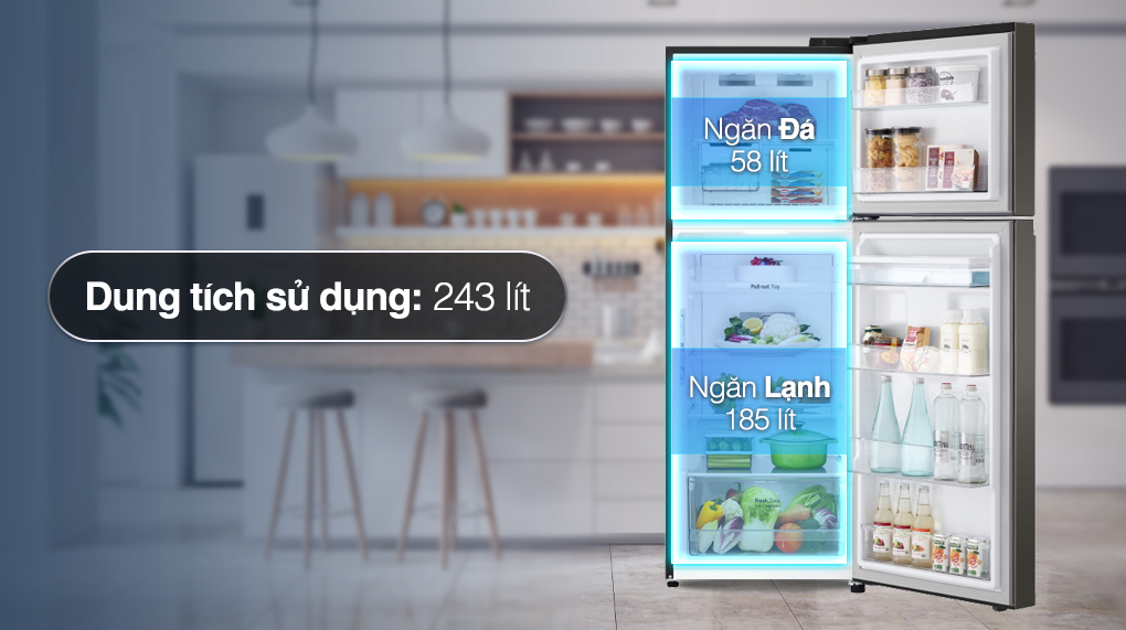 – Dung tích sử dụng 243 lít phù hợp cho nhu cầu lưu trữ thực phẩm của các hộ gia đình có từ 2 – 3 thành viên, hoặc những ai ở một mình nhưng có nhu cầu lưu trữ lớn thì cũng có thể cân nhắc đến dòng tủ lạnh này của LG.
