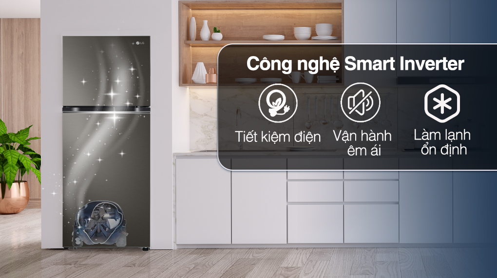 – Công nghệ Smart Inverter được tích hợp trên chiếc tủ lạnh LG có khả năng tự động điều chỉnh tốc độ hoạt động của máy nén, tiết kiệm đến 36% năng lượng tiêu hao. Hỗ trợ máy nén vận hành êm ái, duy trì nhiệt độ bên trong tủ luôn ở mức ổn định, giúp bảo quản thực phẩm tươi ngon hơn.