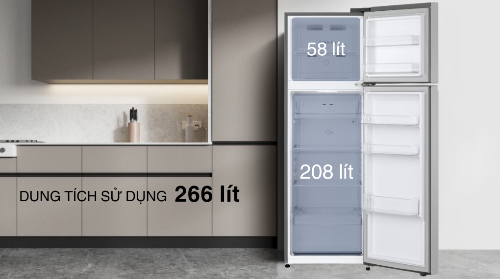 – Dung tích sử dụng 266 lít, trong đó ngăn lạnh 208 lít và ngăn đá 58 lít – phù hợp cho nhu cầu sử dụng hằng ngày của hộ gia đình nhỏ.