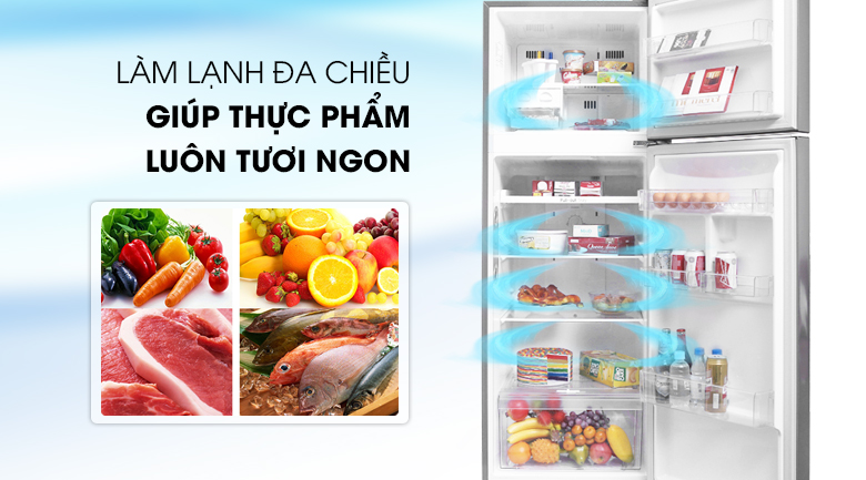 Được trang bị hệ thống khí lạnh đa chiều giúp thực phẩm được làm lạnh đồng đều, hiệu quả đến bất kể ở mọi ngóc ngách bên trong tủ. Với hơi lạnh được tỏa ra theo 3 chiều chính diện, hai bên hông và cánh tủ duy trì ổn định nhiệt độ, bảo quản thực phẩm được lâu hơn.