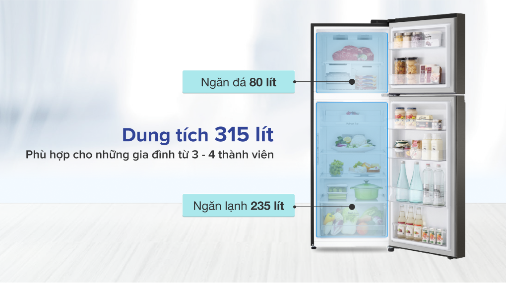 – Dung tích 315 lít phù hợp lượng lưu trữ thực phẩm của gia đình từ 3 – 4 người.