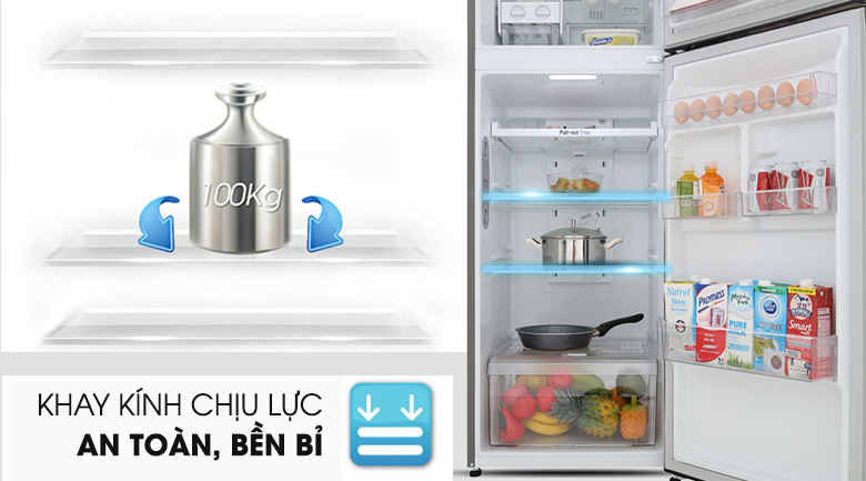 Làm từ chất liệu kính chịu lực, khay chứa của tủ lạnh có thể chịu lực cực tốt lên đến 100kg, giúp bạn thoải mái bảo quản nhiều thực phẩm mà không phải lo lắng khay dễ bị nứt, vỡ.