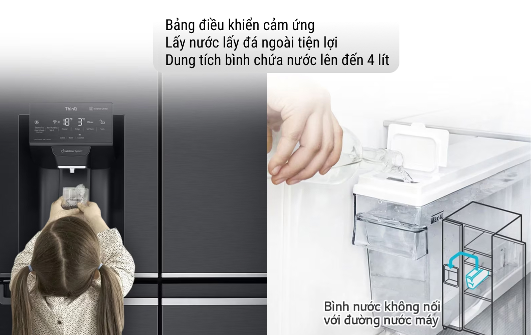 – Bộ phận lấy đá và nước được LG thiết kế ở phía ngoài cánh cửa tủ có khoảng trống cao. Với những chiếc cốc cao, bạn vẫn có thể dễ dàng lấy nước hay lấy đá từ bên ngoài một cách tiện lợi. Điều này giúp tiết kiệm thời gian và không gây phiền toái khi cần sử dụng nhanh chóng mà không cần mở cánh cửa tủ.