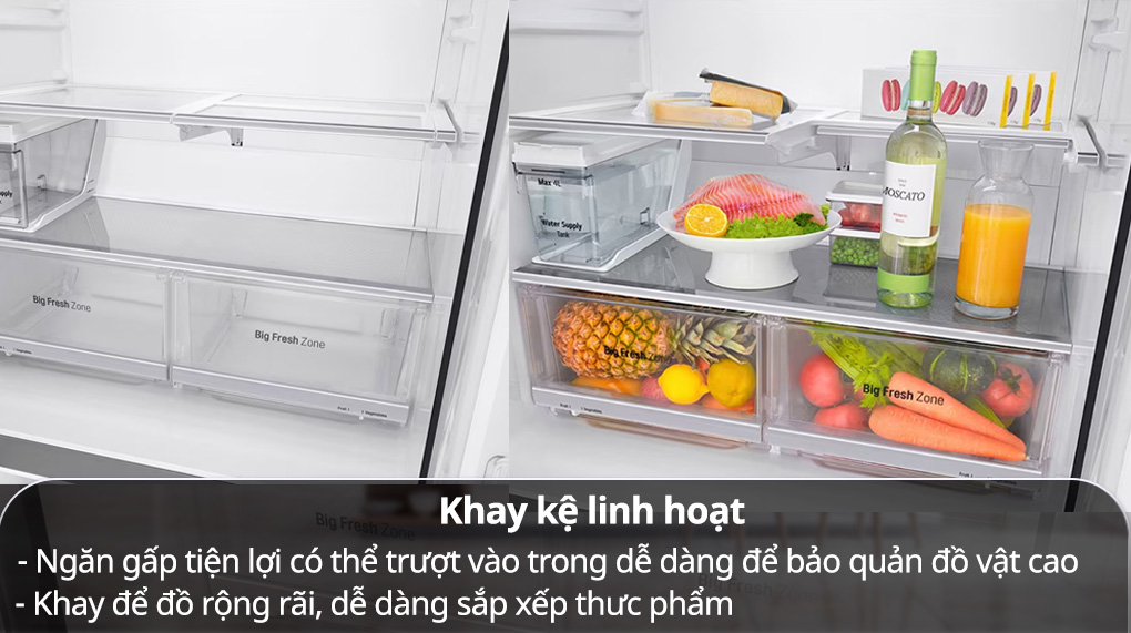 – Tủ có 2 ngăn cân bằng ẩm rau củ Big Fresh Zone. Giúp bạn có thể thoải mái cất trữ một lượng lớn rau củ quả. Không cần lo thực phẩm nhanh hư hỏng. Bởi tủ có khả năng cấp ẩm đặc biệt giữ trọn vị tươi ngon của thực phẩm.