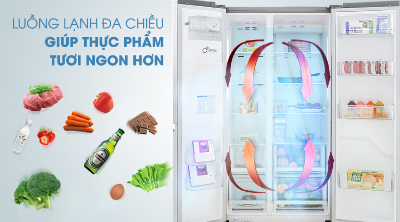 • Công nghệ làm lạnh đa chiều nhanh chóng mang hơi lạnh đến từng ngóc ngách của tủ.