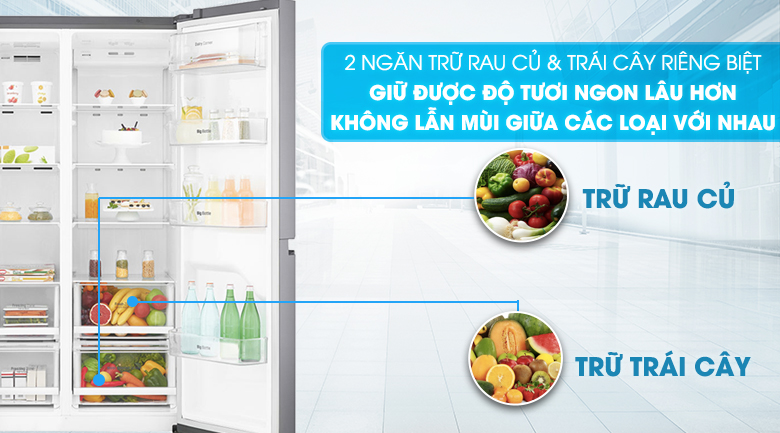 Ngăn chứa rau củ, trái cây trên chiếc tủ lạnh LG Inverter này đã được nâng cấp trở thành 2 ngăn riêng biệt để bạn có thể bảo quản riêng rau củ và trái cây không lẫn vào nhau, tạo thêm không gian, tránh trường hợp chèn ép dẫn đến hư hỏng thực phẩm.