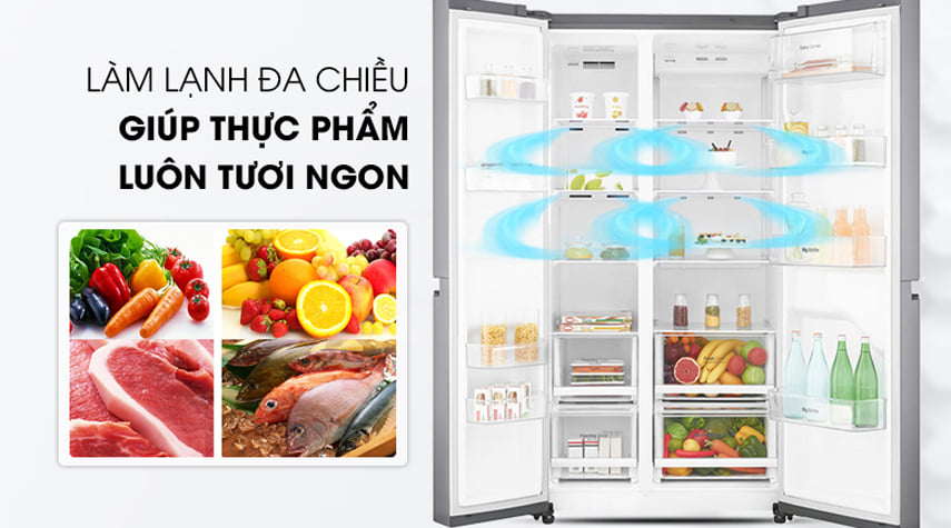 Tủ lạnh LG Inverter này được trang bị hệ thống khí lạnh đa chiều, luồng khí lạnh bên trong tủ sẽ được luân chuyển đến từng ngóc ngách, đảm bảo độ lạnh luôn ổn định và đồng đều cho từng thực phẩm ngay cả khi thực phẩm chứa đầy trong ngăn tủ.