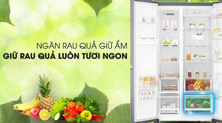 Ngăn rau củ của tủ lạnh LG 649 lít GR-B257JDS kích thước ngăn rau lớn, cho bạn thoải mái dự trữ rau củ số lượng lớn. Bên cạnh đó ngăn rau quả còn có khả năng cân bằng độ ẩm, cho rau củ luôn được tươi ngon, mọng nước trong thời gian dài.