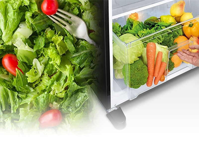 Tủ lạnh có ngăn rau quả lớn dễ dàng thao tác và sắp xếp, duy trì độ ẩm để giữ rau quả luôn tươi ngon. Đèn LED giúp tăng cường lượng vitamin C cho rau củ quả. Ngăn mát dạng trượt lưu trữ thực phẩm chế biến sẵn và chế phẩm từ sữa.