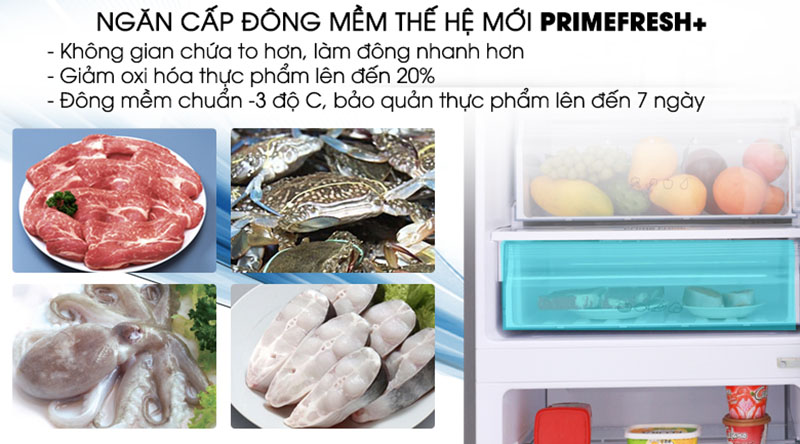 Ngăn đông Prime Fresh Plus này giữ cho nhiệt độ ở mức -3 độ C mà không làm cho thịt cá đông đá lên đến 7 ngày, giúp cho bạn thuận tiện hơn khi lấy ra chế biến và còn giữ được độ tươi ngon tối đa cho các thực phẩm tươi sống, lưu giữ đúng hương vị cho từng loại thực phẩm. Ngoài ra ngăn đông mềm thiết kế dạng kín giúp hạn chế lây lan mùi hôi ra các ngăn khác.