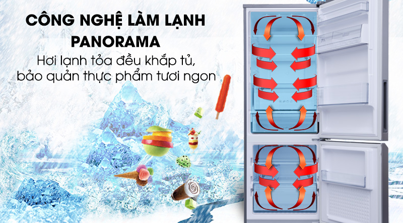 Nhờ có công nghệ Panorama, chiếc tủ lạnh này còn giúp cho thực phẩm được bảo quản lạnh một cách toàn diện với luồng khí thổi nhanh và đều khắp mọi ngóc ngách bên trong tủ.