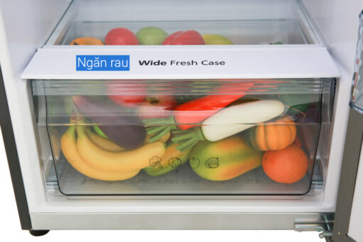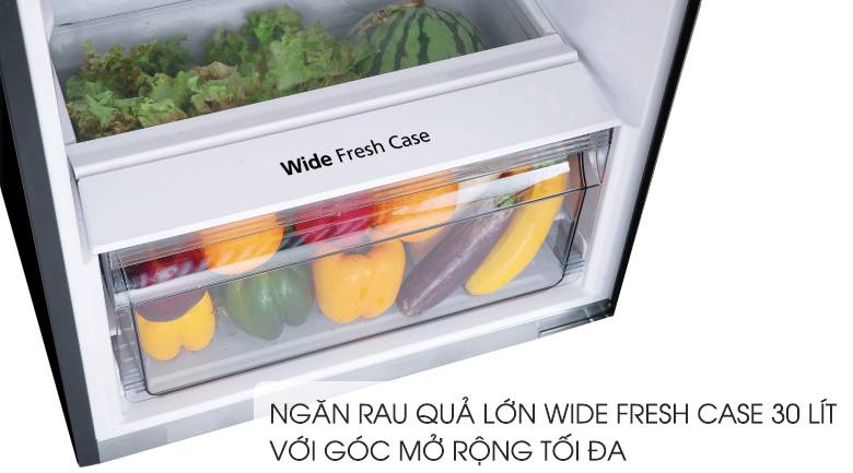 Ngăn rau quả lớn Wide Fresh Case với góc mở rộng tối đa giúp chứa được các loại trái cây, rau củ lớn hơn tránh trường hợp chèn ép gây hỏng thực phẩm