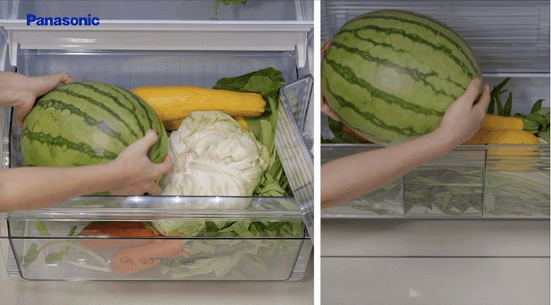Ngăn rau quả lớn Wide Fresh Case với góc mở rộng tối đa giúp chứa được các loại trái cây lơn như dưa hấu, bí đỏ