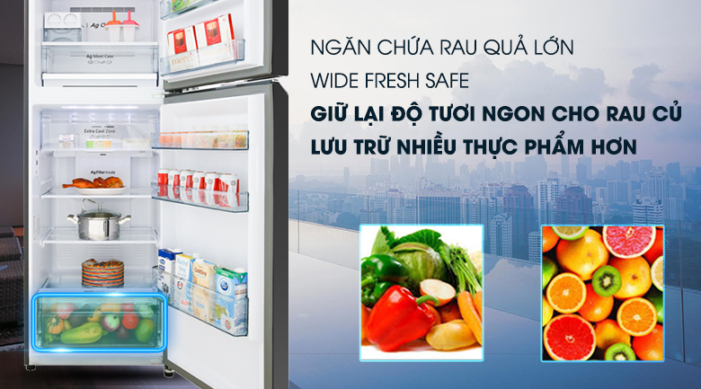 Ngăn chứa Wide Fresh Safe kích thước lớn với khả năng tạo ra môi trường có độ ẩm cao sẽ giúp cho rau củ giữ lại độ tươi ngon, mọng nước lâu hơn. Gia đình bạn sẽ luôn được thưởng thức những món rau củ tươi mới như vừa được mua về.