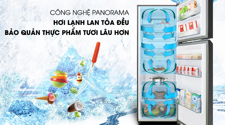 Công nghệ Panorama được trang bị trên tủ lạnh 2 cửa này sẽ mang hơi lạnh lan tỏa đồng đều đến mọi vị trí trong tủ, đảm bảo cho thực phẩm được làm lạnh nhanh chóng và nhận được đầy đủ độ lạnh thích hợp, cho thực phẩm tươi ngon trong suốt thời gian bảo quản.