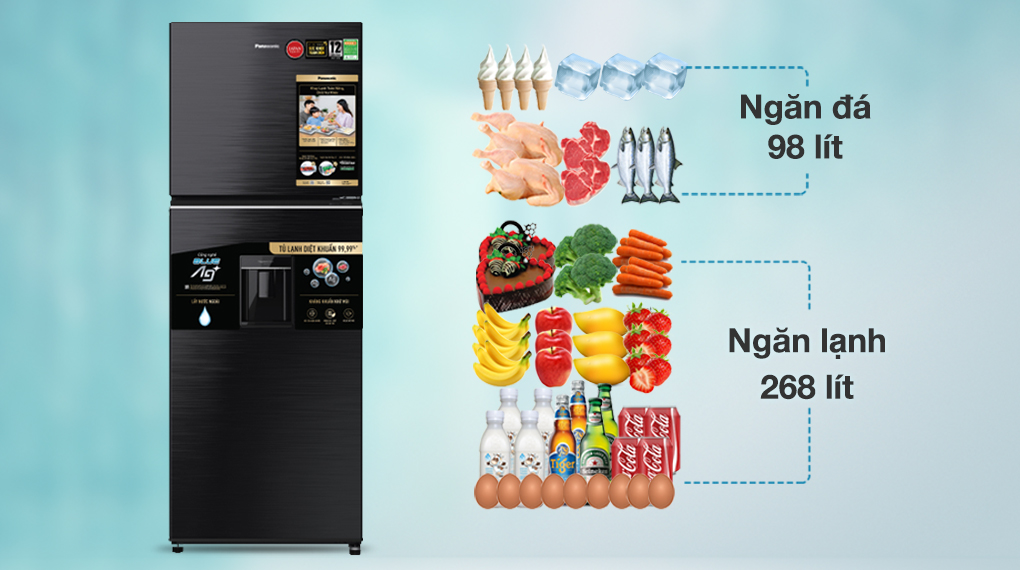– Dung tích 98 lít, hãng Panasonic thiết kế với các ngăn, kệ chia không gian ngăn đá thành nhiều khu vực để bạn cất giữ các thực phẩm đông lạnh thuận tiện.