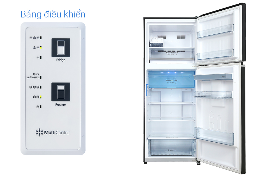 • Công nghệ bảo quản thực phẩm: Ngăn Extra Cool Zone giữ lạnh thực phẩm ở nhiệt độ 2°C, Ngăn rau quả giữ ẩm, Ngăn trữ đông tinh thể bạc Ag Hygience Zone