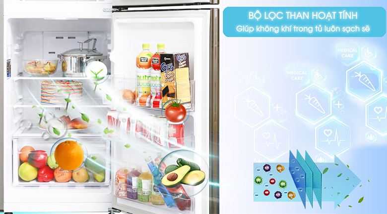 Bộ lọc khử mùi tự nhiên được tích hợp giữ không khí trong tủ lạnh luôn tươi mát và thực phẩm trọn vị tươi ngon. Đặc biệt mùi khó chịu sẽ bị loại bỏ hoàn toàn khi đi qua bộ lọc than hoạt tính giúp không khí trong tủ luôn trong lành.