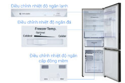 Tủ lạnh Samsung với màu đen nổi bật sang trọng. Thiết kế ngăn đá dưới tối ưu sự tiện lợi cho thói quen mở tủ lạnh ngăn mát thường xuyên hơn của người dùng.